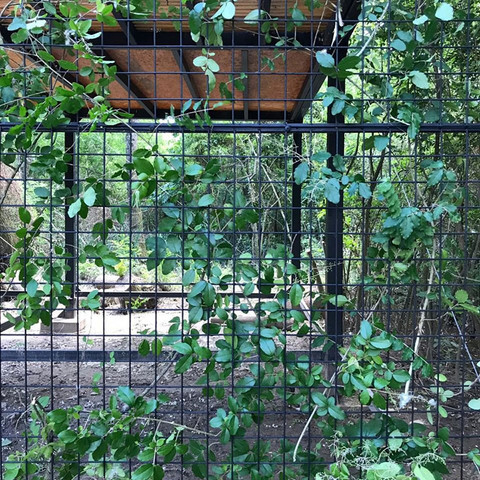 Por las elevadas temperaturas de verano, los proyectistas decidieron colocar parasoles exteriores, con una particularidad notable. “Aprovechamos la propia vegetación del lugar para el diseño de ‘parasoles vegetales’, que son básicamente paneles de mallas electro soldadas sobre los cuales la vegetación puede trepar y generar sombra. Estos paneles no sólo funcionan como parasoles sino también como cerramientos, delimitando en planta baja los sectores y ayudando a conformar el acceso del módulo”.